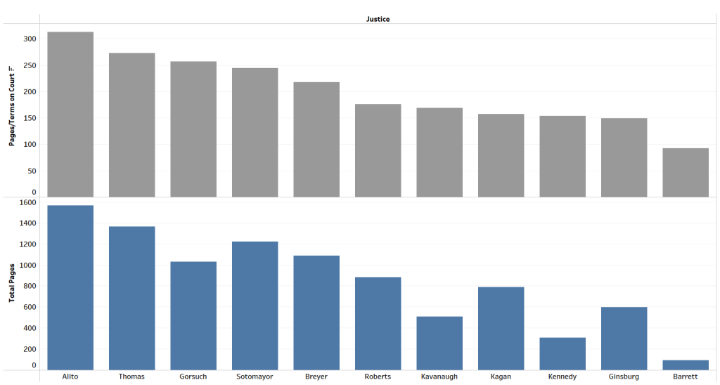 Alito has both the most total pages at 1,565 and pages per term at 313. Thomas comes in next for pages per term and total pages. Gorsuch has the next most pages per term even though he is below Sotomayor for overall pages. This is because Gorsuch was not on the Court for the majority of the 2016 Term. As Barrett only began on the Court last term, she has the lowest number of total pages and pages per term.