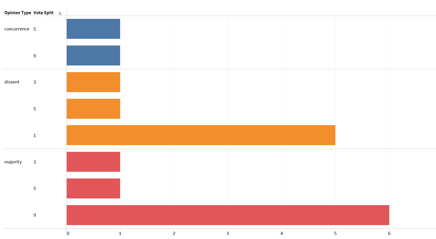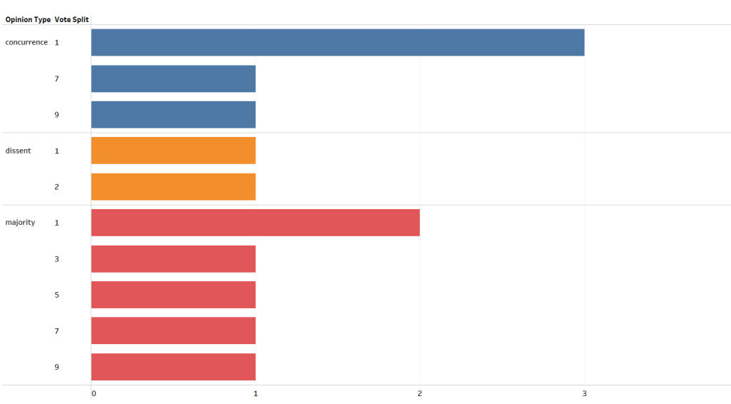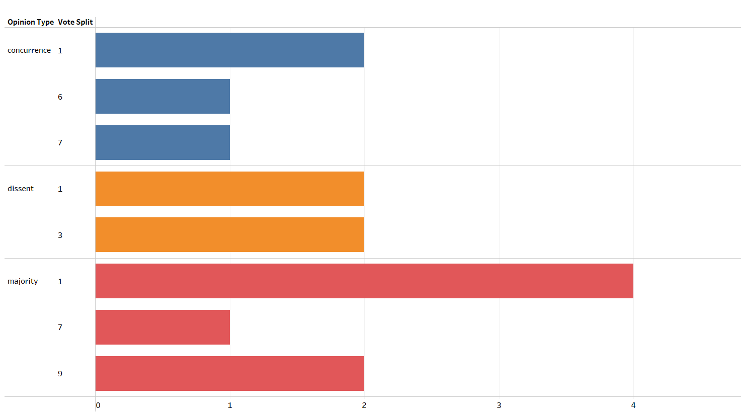 All five of Justice Breyer’s opinions in cases that came down to the difference of a single vote were in dissent. The category Justice Breyer authored the most opinions in was 9-0 majority opinions of which he authored six.