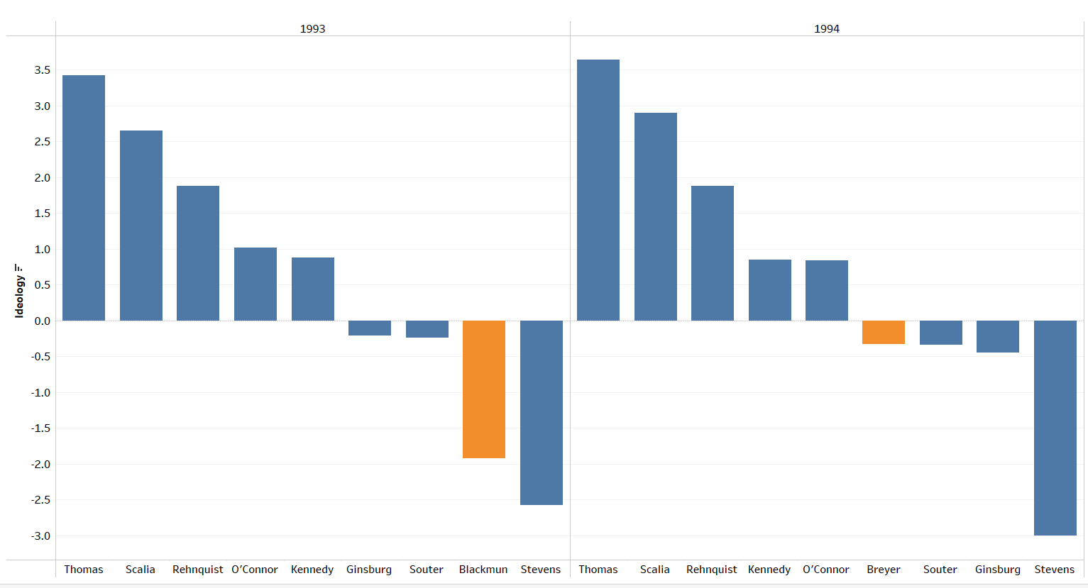 Sometimes as was the case with Justices Scalia, Ginsburg, and Rehnquist, justices pass away during a Supreme Court term and so a replacement is immediately necessary. When Justices retire they can strategically plan to leave the Court at their discretion, when they feel a president will nominate a like-minded successor. This is even more pronounced with Justice Kennedy and Breyer’s retirements where the justices were and will be replaced by their former clerks (Kavanaugh and Jackson respectively). On the other hand, as was the case with Justice Ginsburg, when justices do not heed the call to strategically retire, the door remains open to a large ideological shift if the justice dies while still a member of the Court. Even planned retirements have their hazards though. To get our heads around what to expect when Breyer retires and when Jackson takes his seat, below are several examples from the Court’s modern history.