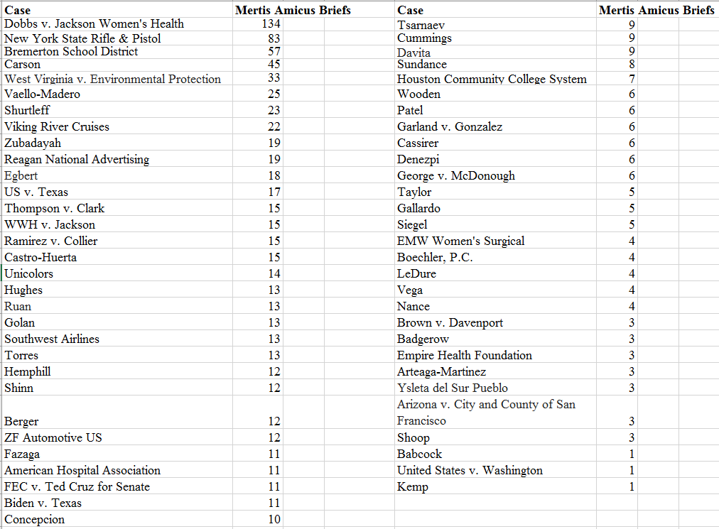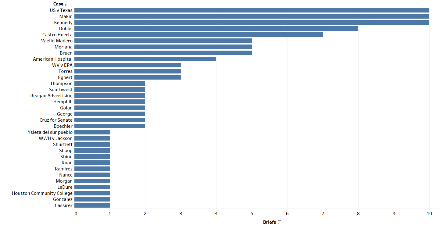 Interested in which Supreme Court cases are getting the most attention this term? In political science one often used measure looks at newspaper coverage of the cases (e.g. http://www.columbia.edu/~jrl2124/salience.pdf). Another tracks amicus briefs. Here is a list of amicus briefs in all argued cases that were accepted on certiorari this term. As far as I can tell the Dobbs case has the record for the most such briefs filed in a case.