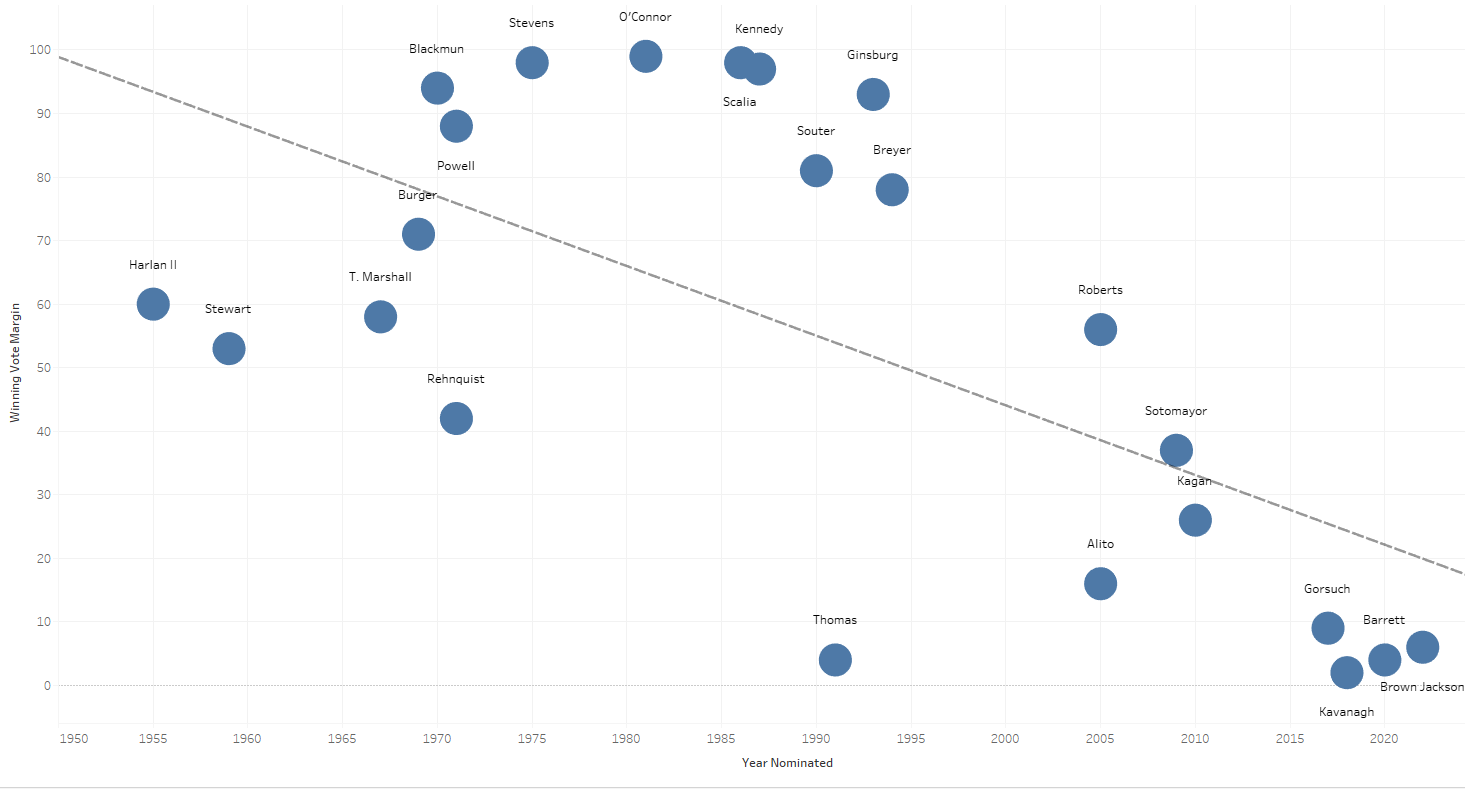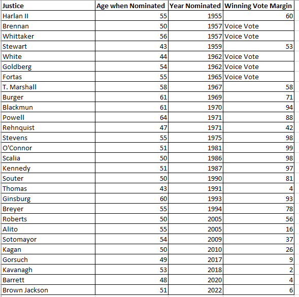 With Judge Jackson now becoming Justice Jackson here is some historic info. This spreadsheet and graphic look at Justice confirmations since 1950.