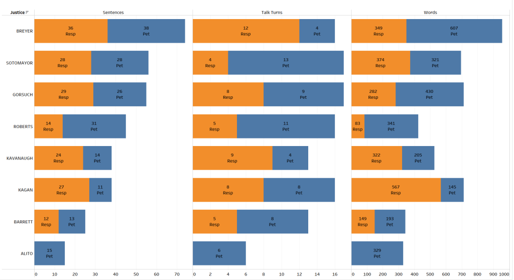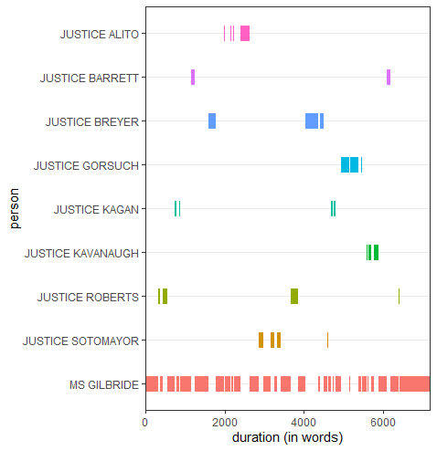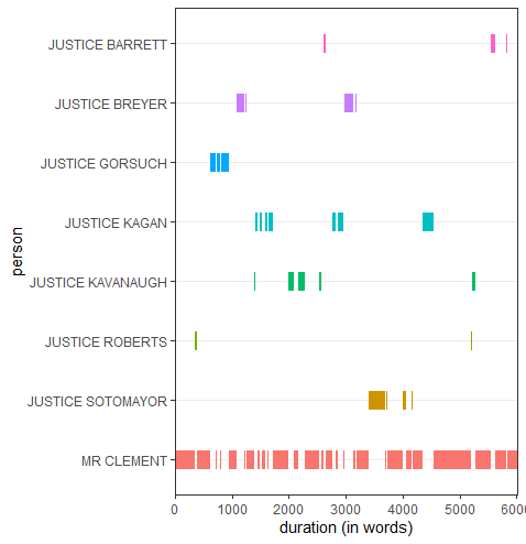 Justice Kavanaugh has multiple small chunks of engagement and CJ Roberts adds only a little bit during these arguments. Hopefully this visual layout helps with an understanding of how arguments can be quantified.
