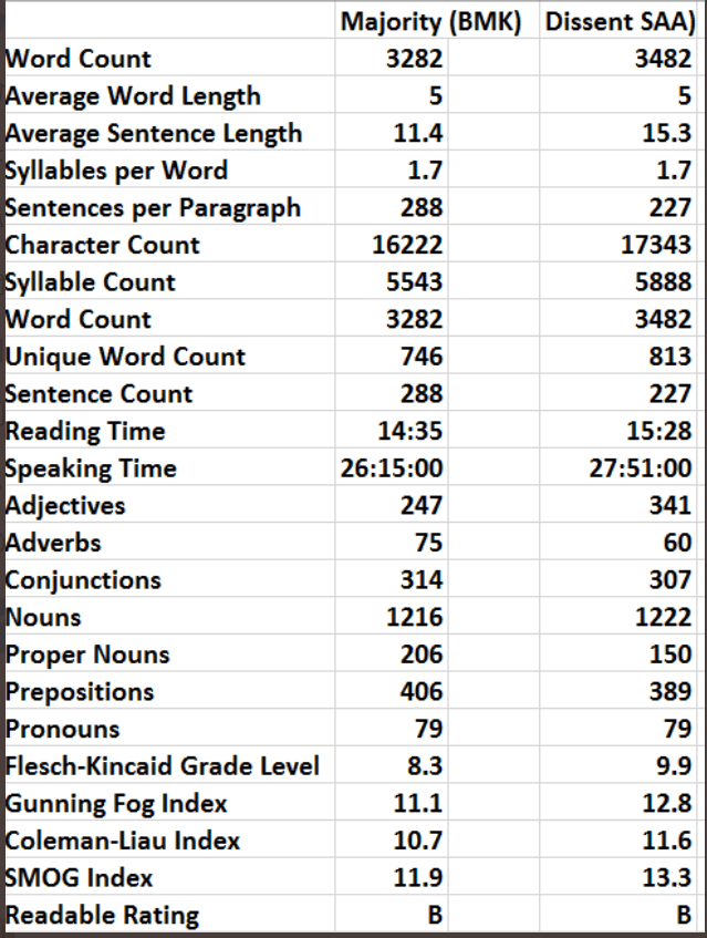 Finally, the text statistics broken into two columns for comparison. The first column looks at the majority opinion and the second column examines the dissent