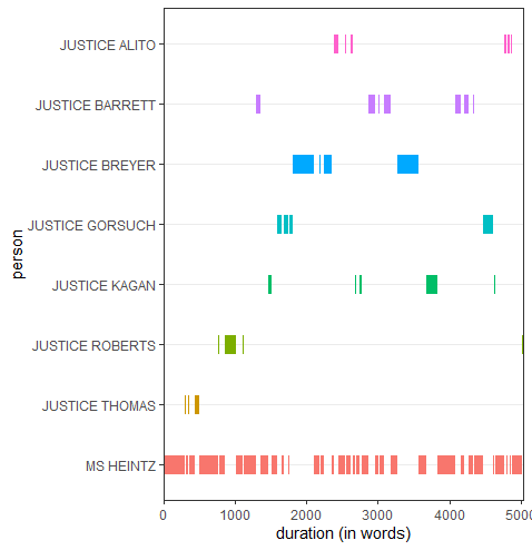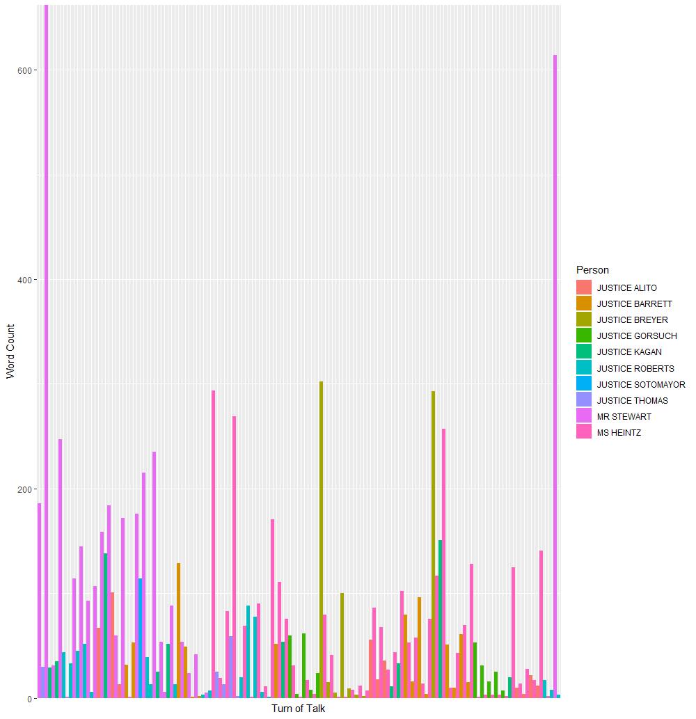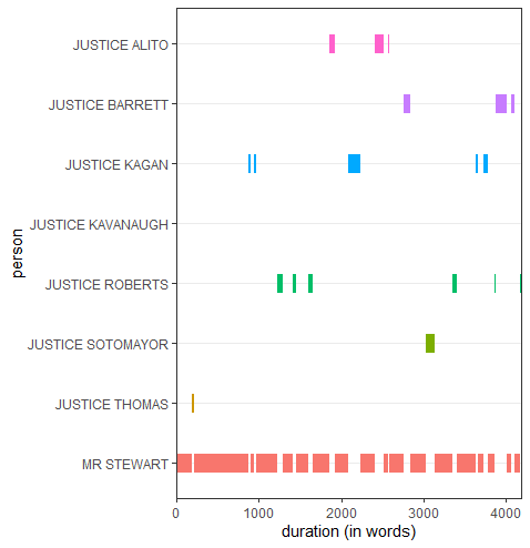 There are several aspects of the arguments worth perusing. First is the total engagement of the justices. The first figure shows the overview of talking. Malcolm Stewart has the longest talking turns while Justice Breyer has the most extensive turns for the justices. Justice Barrett engages with both sides.