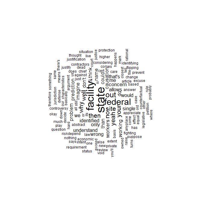 The most common words in the overall arguments are shown in this wordcloud. State, federal, and facility all come up frequently implying the concerns of federalism inherent in this case.