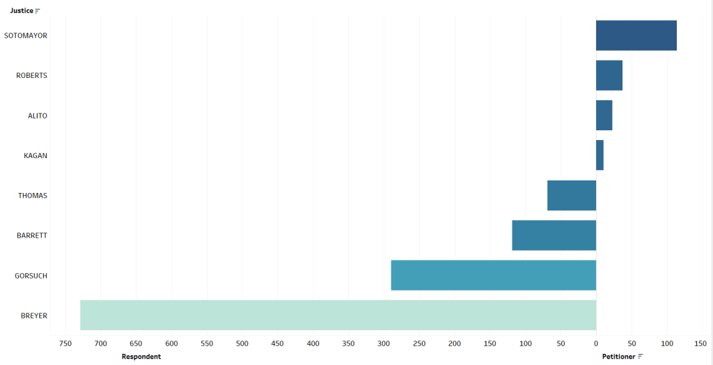 When we look at the arguments broken down by side we see how the justices focused their relative attention on either party. Justice Kagan for instance was active during the petitioner’s arguments while Justice Thomas was much less so.