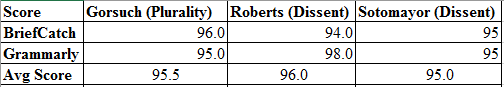 The scores are all top-notch. The small increments between them show that the average quality scores ranked Gorsuch’s opinion the highest, followed by Roberts’, and Sotomayor’s.