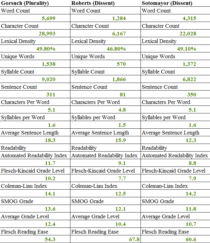 Several things are evident from this comparison. First Gorsuch’s opinion is the longest, then Roberts’, and then Sotomayor’s. Based on the average grade level, Gorsuch’s opinion is the most is most advanced, then Sotomayor’s, with Roberts’ closely behind. Gorsuch’s sentences are longest on average followed by Roberts’, and then Sotomayor’s.