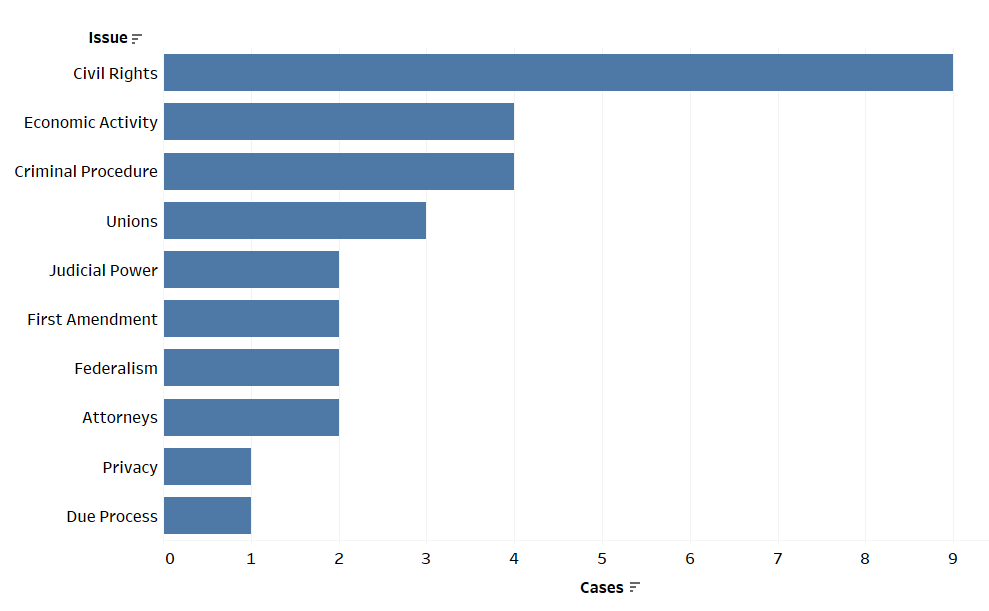 According to the Database’s more general issue coding seven cases dealt with civil rights, four with economic activity, four with criminal procedure, three with unions, two with judicial power, two with the First Amendment, two with federalism, two with attorneys, one with privacy, and one with due process.