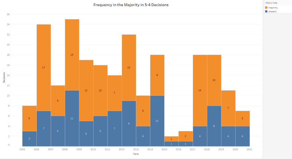 If we move the scope of this analysis out to view decisions made by a single vote where Alito was in the Court’s majority versus when he was in dissent the graph shows the following: