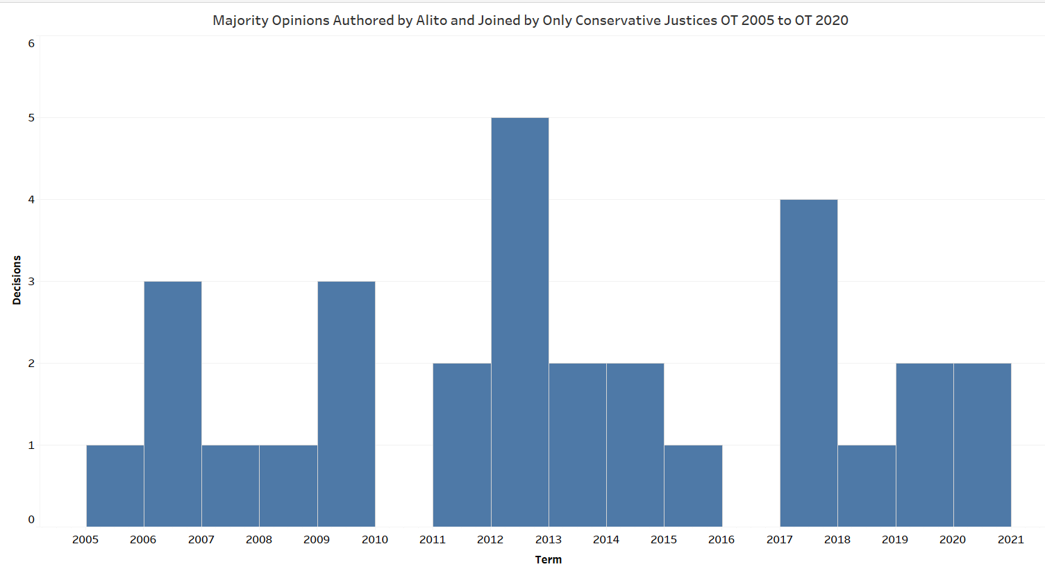 One way to understand Justice Alito’s behavior on the Court is through examining his authorship of majority opinions in cases decided by a single vote where no liberal justice sat in the majority. This has happened 30 times — one time in 2005, three times in 2006, one time in 2007 and in 2008, three times in 2009, two times in 2011, five times in 2012, two times in 2013, two times in 2014, one time in 2015, four times in 2017, one time in 2018, two times in 2019, and two times in 2020.
