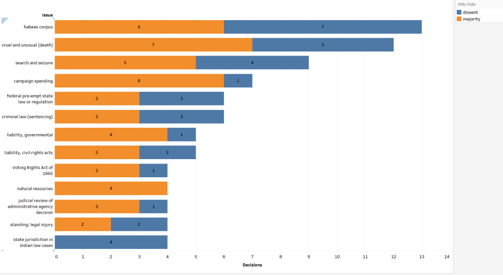 Based on this graph we see that Alito was in the majority more frequently than in dissent for six issues — death penalty, search and seizure, campaign finance, liability in civil rights act cases, natural resources, and cases dealing with judicial review of agency decisions; he was in dissent and majority an equal number of times in three of these areas — federal preemption of state laws or regulations, criminal sentencing, and standing cases; and was in dissent more often than in the majority in two case areas — habeas corpus and state jurisdiction in Indian law decisions.
