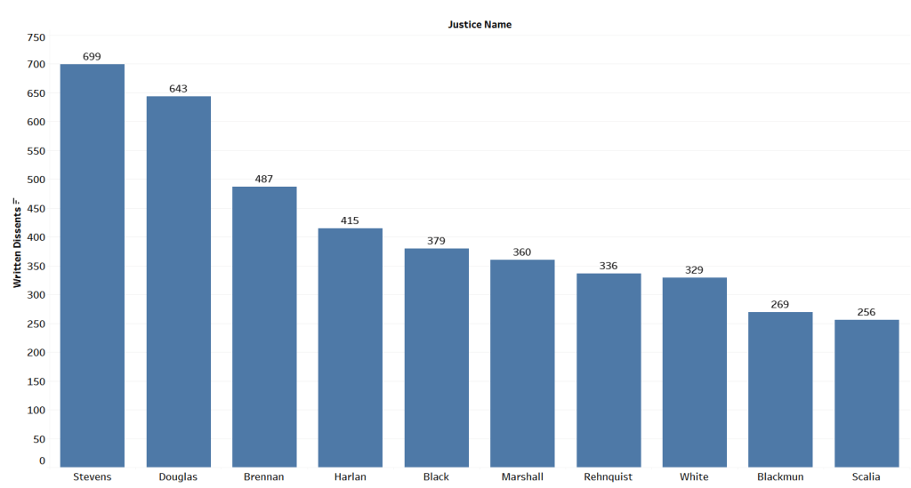 First a look at the most prevalent dissenters on the Court. While Scalia had some of the fiercest of dissents in recent years, he was not a top written dissenter in terms of dissent count.