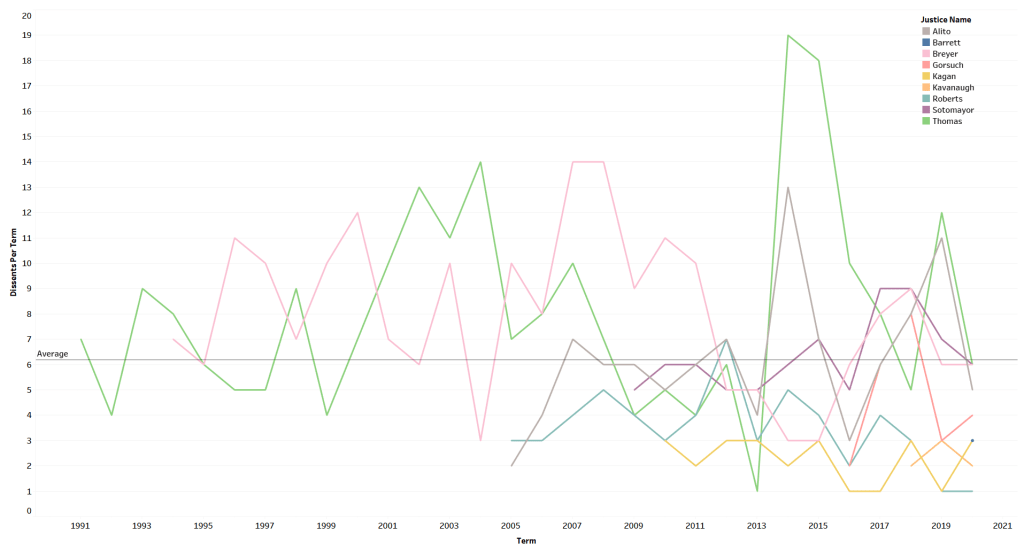 Interestingly while Thomas had the most dissents of the current justices, Breyer has been just a bit more of a frequent dissenter than Thomas who already sat on the Court for three more terms than Breyer.