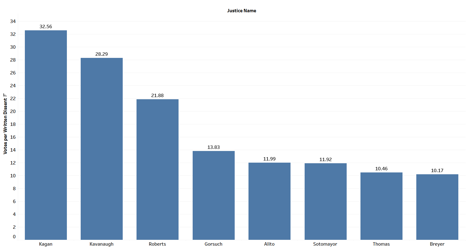 We can use the same metric to see which justices write dissents most and least frequently. This graph removes Justice Barrett because she was only on the Court so far for one term prior to the current one.