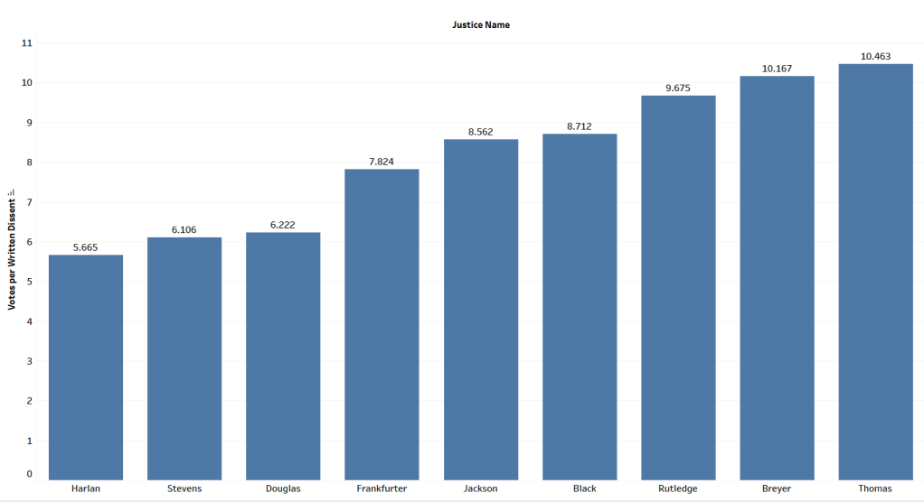 Justice Harlan II dissented most frequently with one dissent for every 5.665 votes. Harlan is followed by Stevens, Douglas, and Frankfurter. Two current justices, Thomas and Breyer also make appearances on this graph.