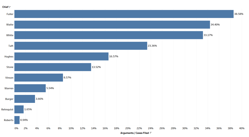 In fact, from chief to chief justice, the Court has heard an ever decreasing percentage of cases on oral argument based on all the cases filed to it since 1880 except in one instance (the Fuller Court heard a greater percentage of cases filed than the Waite Court). The Federal Judicial Center provides Supreme Court filing statistics between 1880 and 2017. The following graph shows the average percentage of oral arguments divided by cases filed to the Supreme Court by chief justice going back to the 1880 term.
