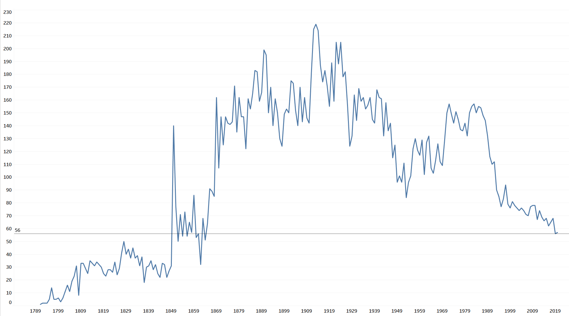 Since the number of oral arguments has dropped since 2017, presumably the Roberts Court’s average is even lower than that shown in the graph. The Court’s lack of productivity is also evident in the following graph (based on cases orally argued derived from the Supreme Court Database) showing how it hit a modern day low last term when the Court decided the fewest number of cases on oral argument since the Civil War.