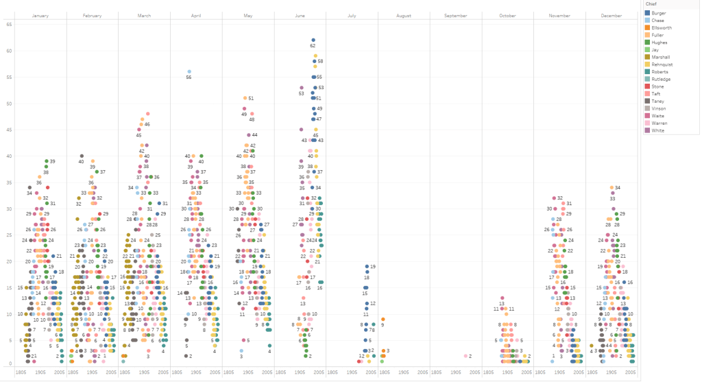 Many of the high watermarks were from the Burger Court in the month of June. The Chase Court exceeded all other Courts in the month of April with a 56 decision month. The Roberts Court tends to be consistently on the low end of monthly output compared with other Court Eras.