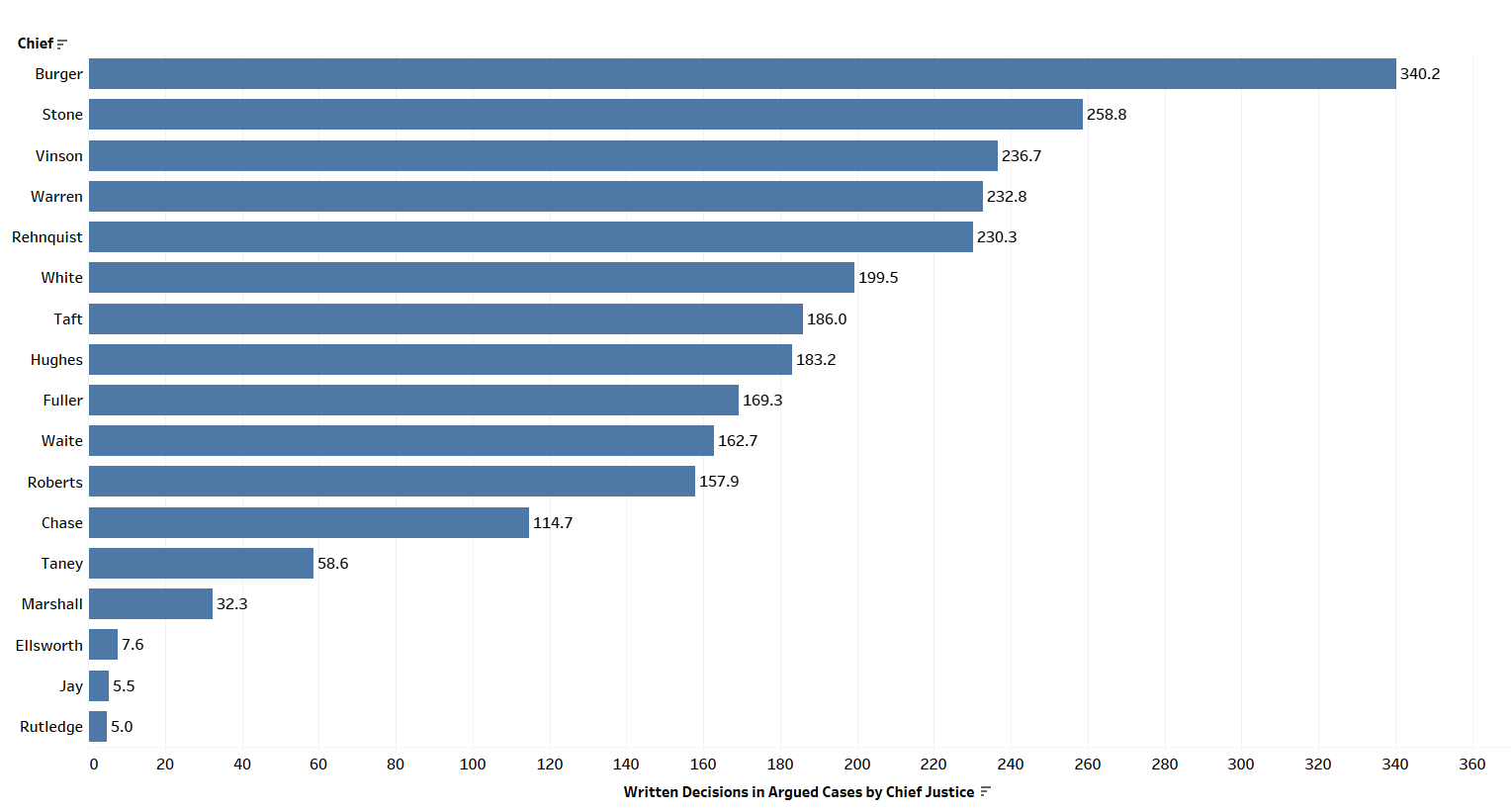 The only Courts that were less productive than the Roberts Court were under four of the first five chief justices. The only reason that Rutledge, the second Chief Justice, is not on this graph is that he only served in this role from August through December of the 1795 Term.
