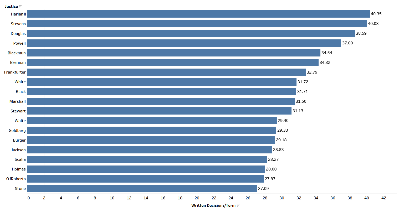 This is, however, the most promising graph for the current Court’s production. Justice Stevens, the second most productive justice by this metric, sat on the Roberts Court from 2005 through 2010. Justice Scalia, also a member of the Roberts Court for several years, is on this graph as well. The other 18 of the top 20 most productive justices based on written opinions per term, however, did not sit on the Roberts Court.