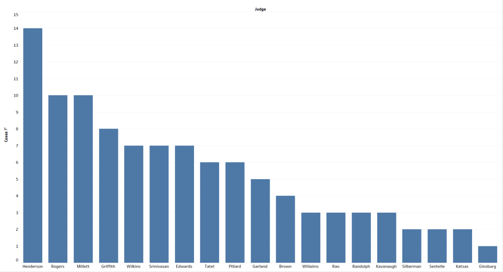 I examined 33 published appeals decisions from cases where Brown Jackson was the district court judge below. 31 of these were three-judge panel decisions and two were en-banc decisions. The number of cases involving each appeals court judge is as follows: