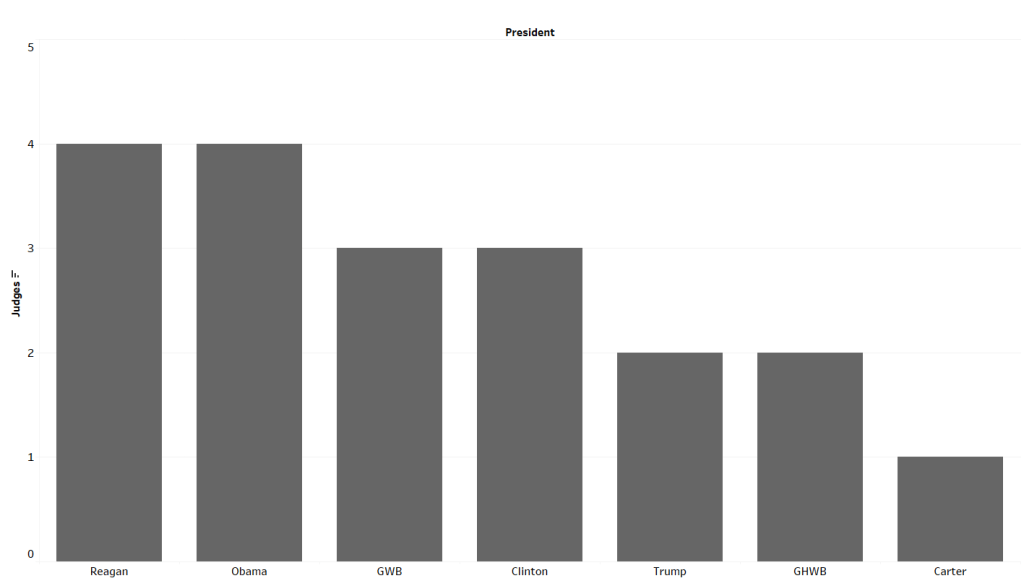 The appeals panels included 11 judges appointed by republicans and eight judges appointed by democrats. The next graph shows the appointing presidents of each of the appeals court judges.