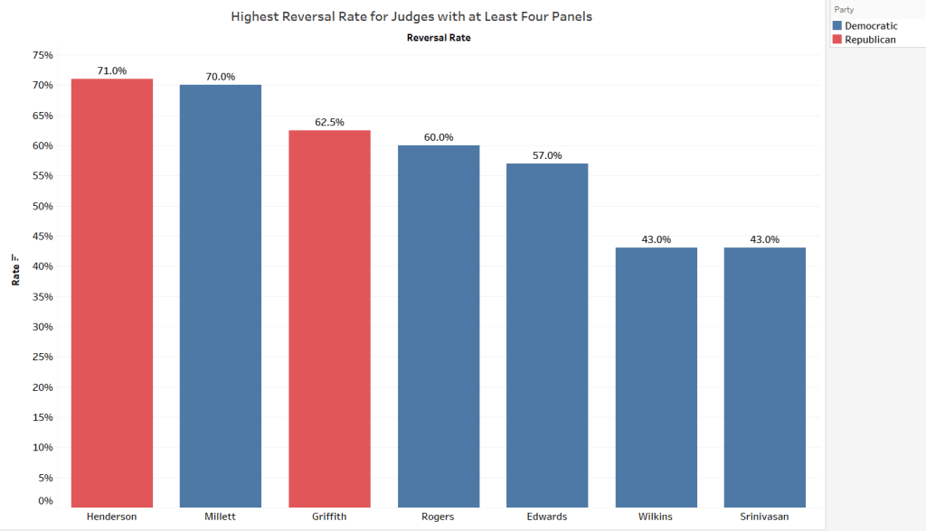 Surprisingly, all four decisions from panels with three judges appointed by all democrats voted to reverse (at least in part) Brown Jackson’s decisions. These cases were Crawford v. Duke (with Judges Millett, Rogers, and Pillard), Sickle v. Torres Advanced (with Judges Rogers, Srinivasan, and Millett), Pavement Coatings v. USGS (with Judges Millett, Wilkins, and Rogers) and United States v. Johnson (with Judges Srinivasan, Edwards, and Rogers). There were also no cases with all republican judge panels, two en banc decisions, and four cases with split votes on the panels. One split vote was DR/R with a republican and democrat voting for Jackson’s position and a republican voting against, one panel was D/RR with the republicans voting against and two panels were R/DD with democrats voting against.