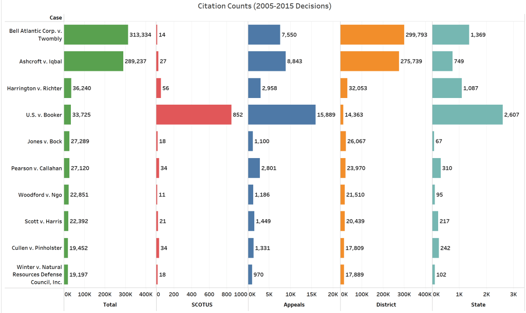 The top cited case, Johnson v. United States (2015) affected thousands of sentences holding the Residual Clause of the Armed Career Criminal Act was unconstitutionally vague and Kingsley v. Hendrickson (2015) sets the standard for pretrial detainee excessive force claims. In terms of trial standards, Spokeo v. Robins (2016) clarified Article III’s standing and injury requirements while Biestek v. Berryhill (2019) looked to the underlying data an expert needs to proffer to support his or her testimony.