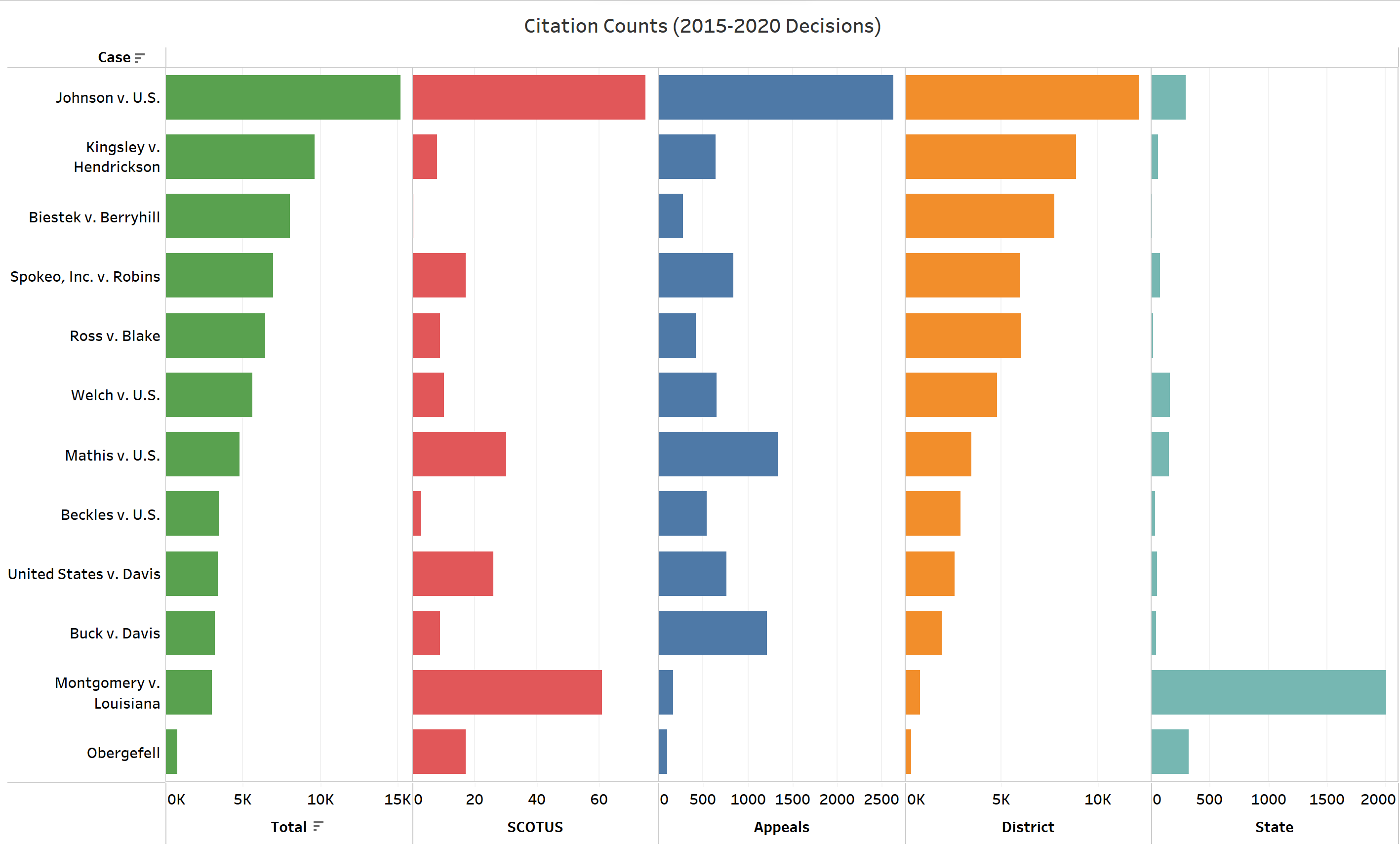 Obergefell was included in this set not because of its high citation count but rather to show how a decision that is so often discussed in the media is not generally cited as frequently as other, lesser known cases that are more generally applicable across case types.