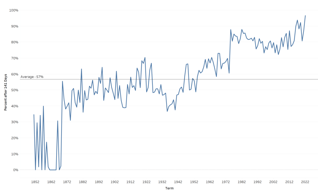 How does this timeframe compare with the Court’s historic opinion releases? Issuing opinions in 2 of 60 total cases equates to 3.33% of the Court’s caseload for the term leaving 96.67% of the Court’s caseload to go. Now for the analysis. The graph below shows the Court’s percentage of cleared, orally argued cases 141 days into a term dating back to 1850 (note that the Court’s docket was sufficiently small prior to 1850 that there is a lot of unnecessary noise in the graph if I included prior years due to the percentage changes from each cleared case. Still, no percentage prior to 1850 was as high as the current term’s percentage of the docket left to clear).