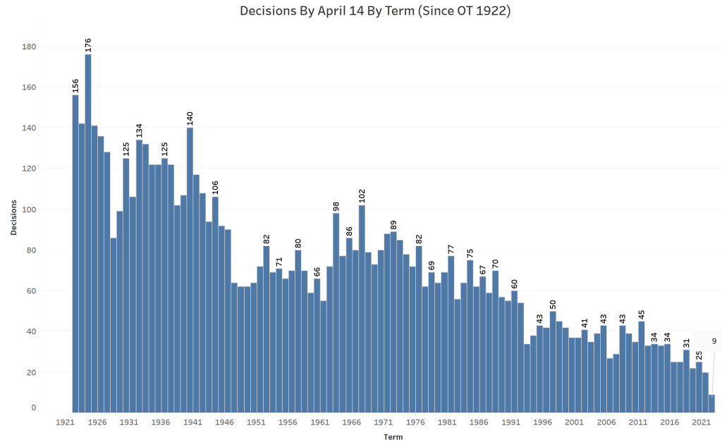 As April 14th is the next day when the Court is expected to release more opinions from argued cases, this date in the marker used for tracking the pace of decisions released. Since the Court has started its term in October for more than the past hundred years, the April 14th marker was used to track the Court’s progress for each term since OT 1922. As the graph below shows, the Court is well behind even the 20 decisions released by April 14th last term, which was a new low for decisions by that date over the last century.
