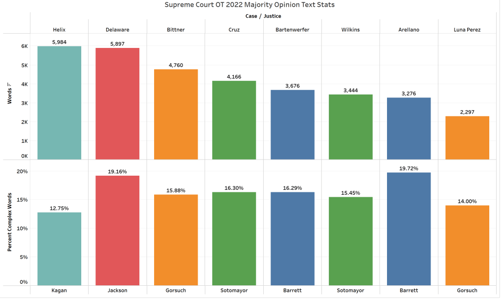 The next set of comparisons have to do with each opinion’s language complexity based on a dictionary of complex terms. This is used to measure reading ease of each opinion. Although much of the verbiage in each opinion relates to words specific to each case, some of the language measured is likely distinct to each justice’s lexicon. The most linguistically complex decision this term (shown below the word counts) came from Justice Barrett with Justice Jackson’s opinion in Delaware v. Pennsylvania tracking closely behind.