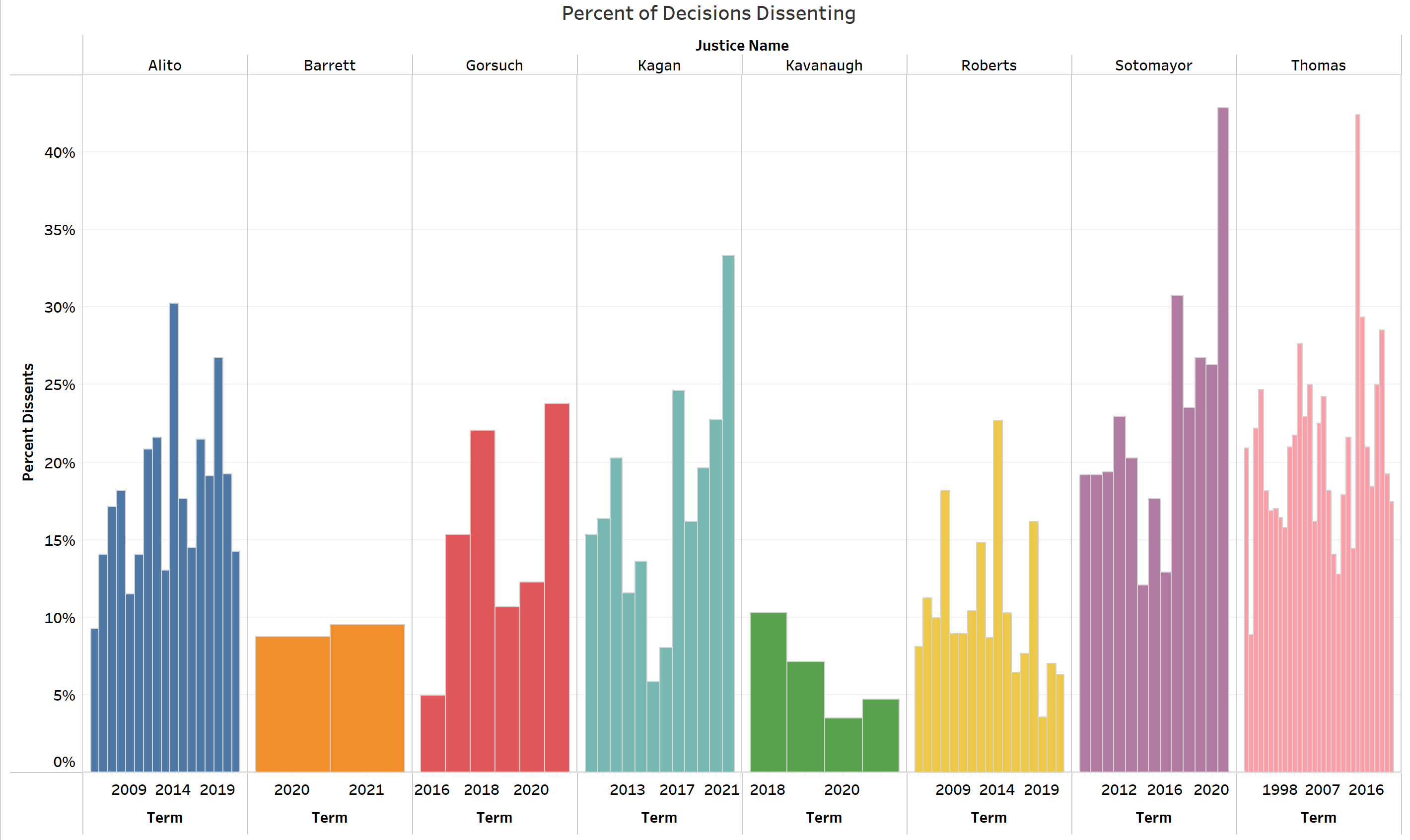 Of the eight justices returning to the Court from last term, six authored fewer dissents as a fraction of their overall opinion count in their first term compared with subsequent terms. Only Justices Thomas and Kavanaugh authored a larger fraction of dissents in their first terms.