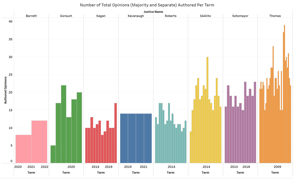 Almost all the current justices authored more decisions in subsequent terms than they did in their first term or two on the Court.