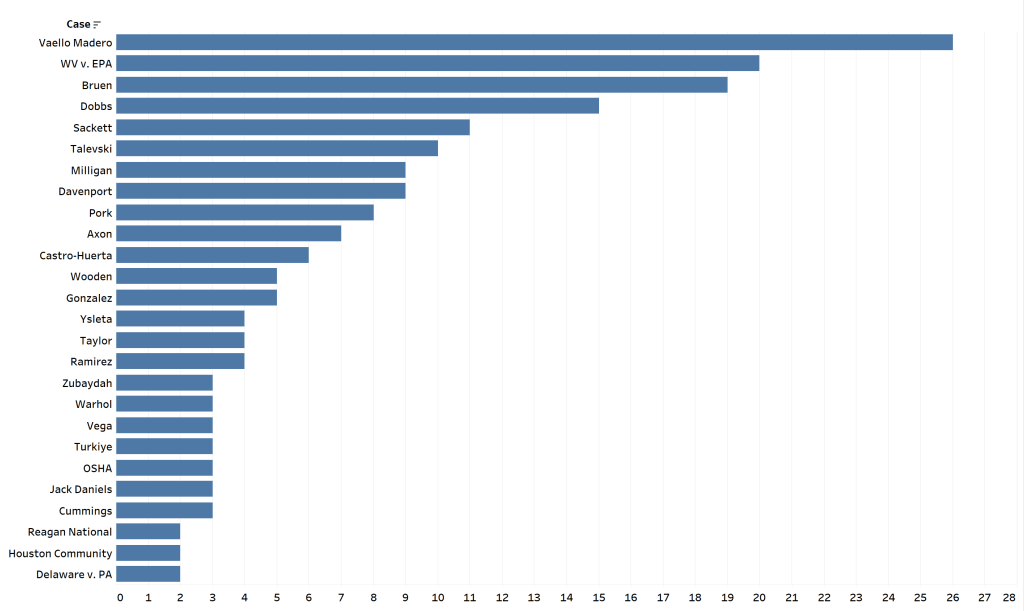 The most articles cited in a case was 26 in U.S. v. Vaello Madero, a case where the Court decided that the Constitution does not require Congress to extend Supplemental Security Income benefits to residents of Puerto Rico. This case outpaced the three cases where one might have surmised we would see the greatest number of articles in Bruen, Dobbs, or West Virginia v. EPA. The most cites in a decision so far this term was 11 in Sacket v. EPA followed by 10 in the Talevski case.