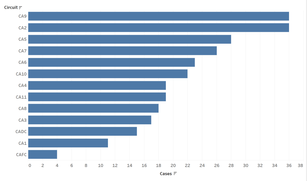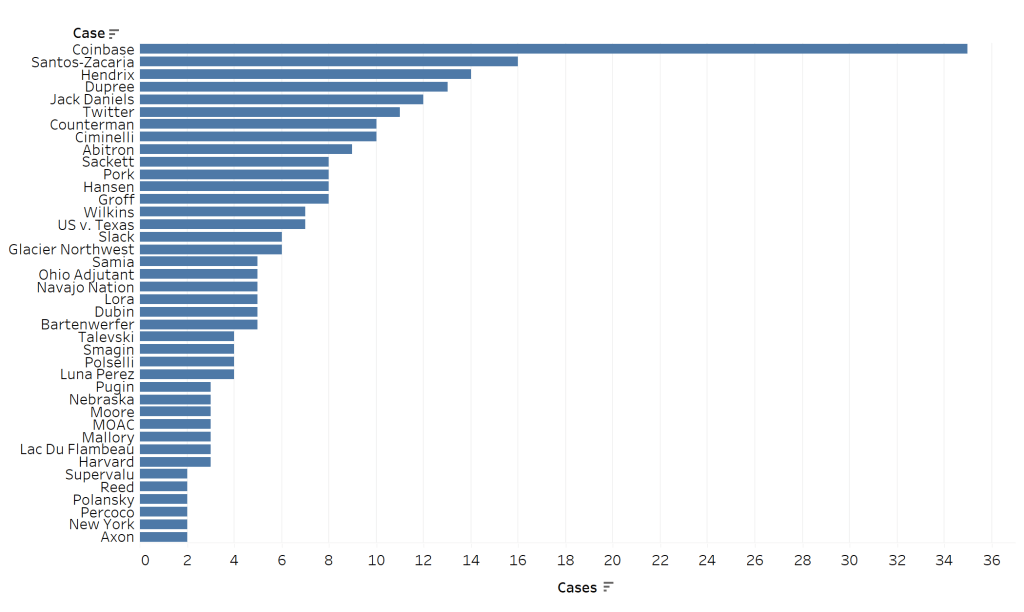 The 35 cites in Coinbase are more than double the number of cites in Santos-Zacaria (16) which has the second highest number in the set. The citations in Coinbase, a case decided by the 9th Circuit below, show how the justices aren’t only looking at lower court citations from the same circuit below as the circuit decision in the case. While there were seven citations to 9th Circuit decisions in Coinbase there were 28 citations to decisions out of other circuits. Also, if anything there was a negative correlation between the most anticipated decisions for the term, like those in the affirmative action cases, 303 Creative, or in Milligan and a large number of citations to decisions from the circuit courts.