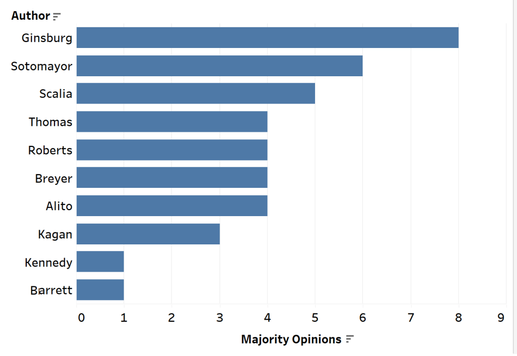This graph correlates with the previous one showing that Justices Sotomayor and Thomas authored the most of these opinions since 2010. Justices Gorsuch, Kavanaugh, and Jackson do not even make it on this graph and the other justices are less likely on the balance to author the Court’s next majority opinion.