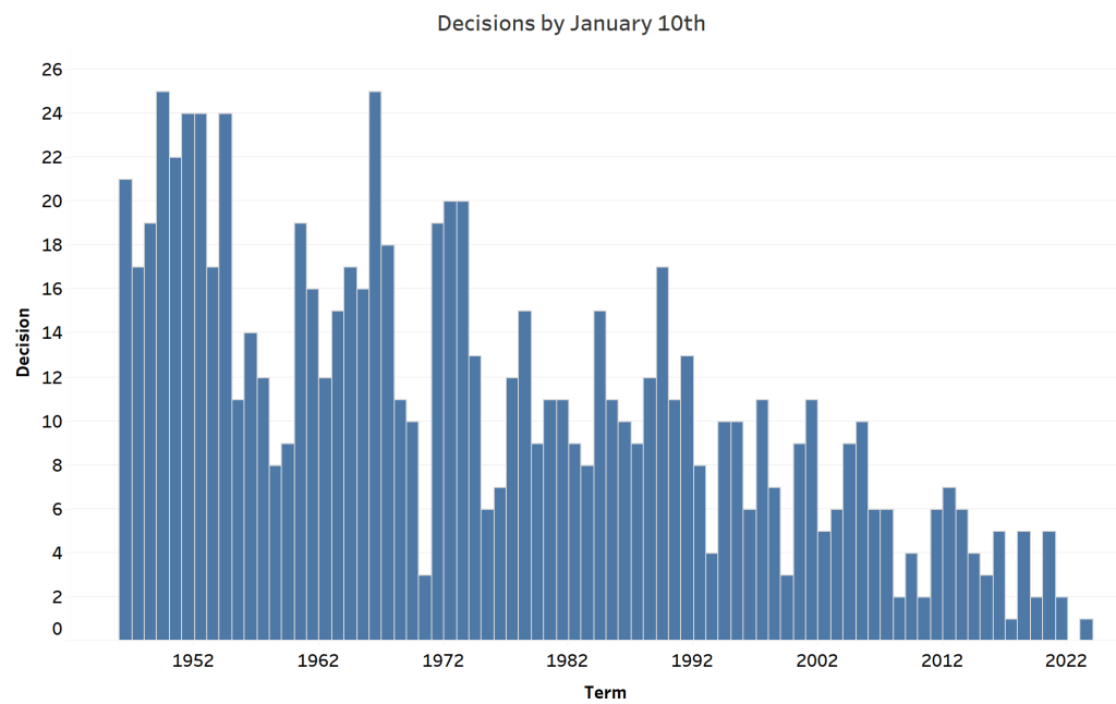 The downward slope of the trajectory of decided cases in the graph showcases the Court’s approach over time. A similar finding is evident from looking at the time between arguments and decisions in cases decided by January 10th in a term starting in 1946.