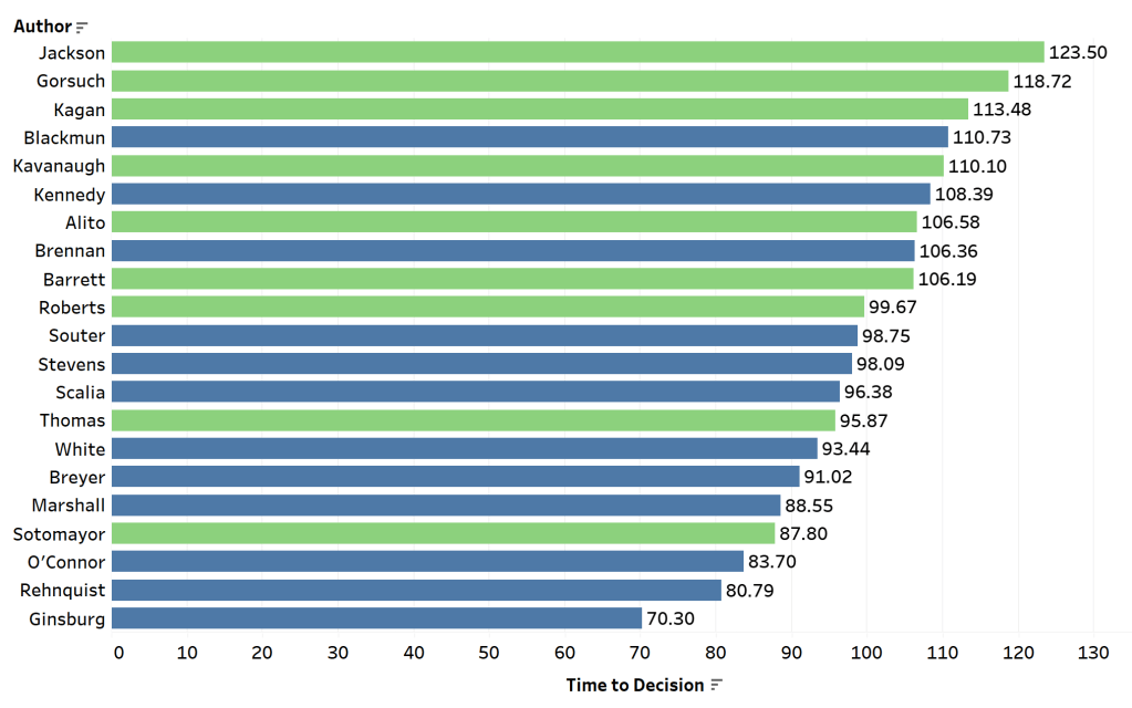 Who should we expect to author the next set of the Court’s decisions? There are a few ways to derive a prediction for this. The first is to look at the justices’ decision release paces based on the average time between arguments and decisions. We need a few years of data to generate helpful predictions so Justice Jackson’s one term on the Court does not assist with this enterprise (and she did not have an opinion by the end of January 2023). The following graph shows these average times for justices on the Court since 1988, the year when Congress passed the most recent statute relating to the Supreme Court’s jurisdiction, which left certiorari as the main vehicle for the Supreme Court to take on cases. Justices on the current Court have bars shaded green.