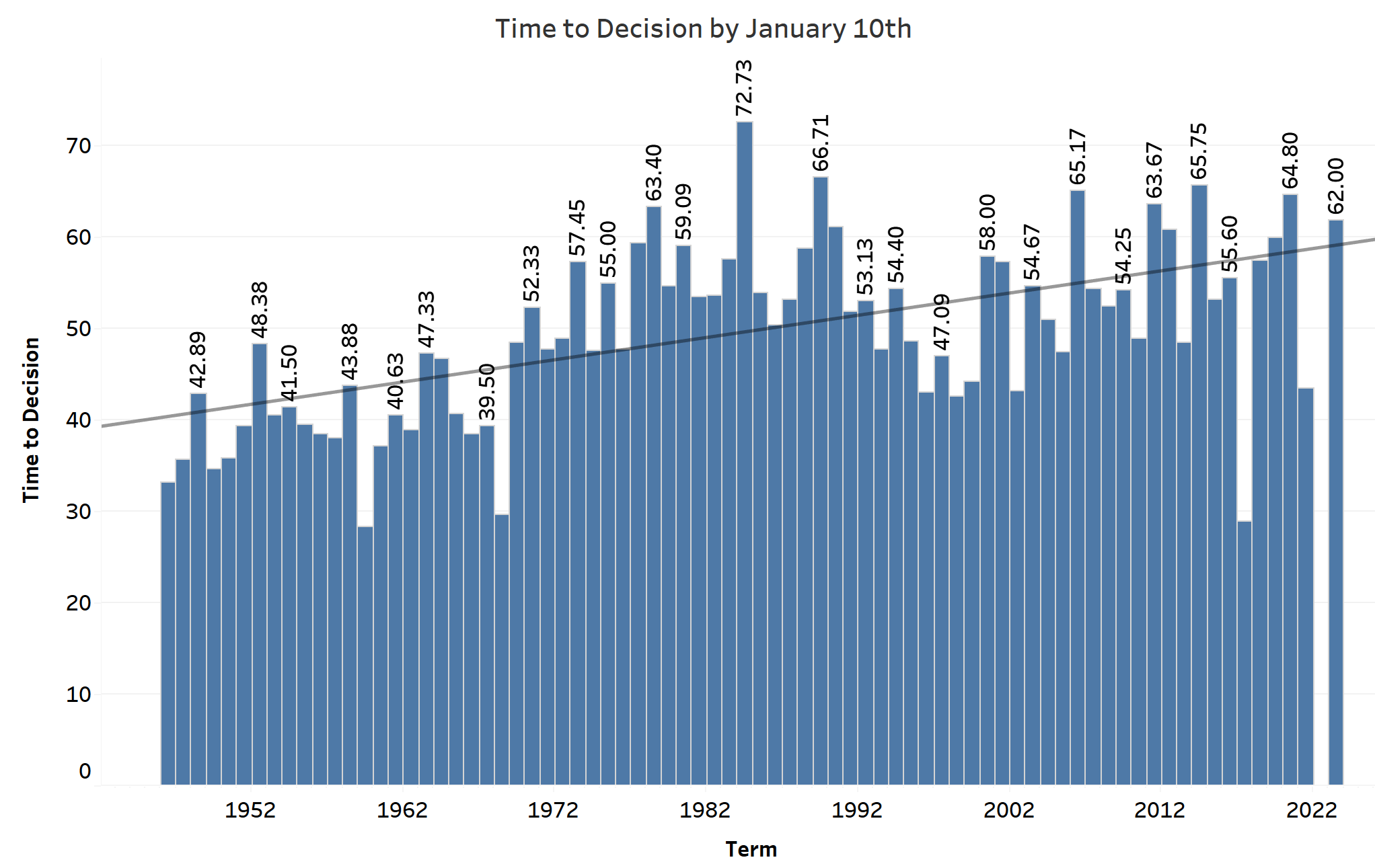 The downward slope of the trajectory of decided cases in the graph showcases the Court’s approach over time. A similar finding is evident from looking at the time between arguments and decisions in cases decided by January 10th in a term starting in 1946.