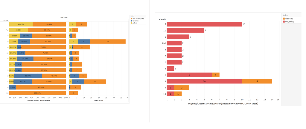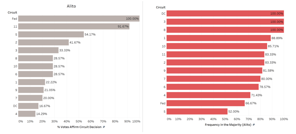 The three years of data only allow for limited inferences and more accurately provide a recent snapshot of the relationship between the justices and the circuits. Additional years and more data could both help and hinder our understanding of the justices’ decisions. The courts of appeals judges on a circuit fluctuate more often than the Supreme Court Justices if not for any other reason that there are many more of them and so there are many more opportunities for turnover. It is hard to draw conclusions over broad time periods for this reason. Fewer decisions over a smaller number of years though might not provide as robust support for any conclusions. These three years only provide a small snapshot of the Court’s cases. Justice Jackson was only on this Court for one complete term and so her statistics are even less telling than those for the other justices. All of this should be accounted for in drawing inferences from the data.