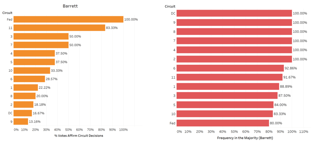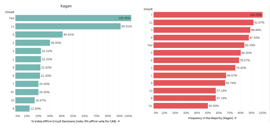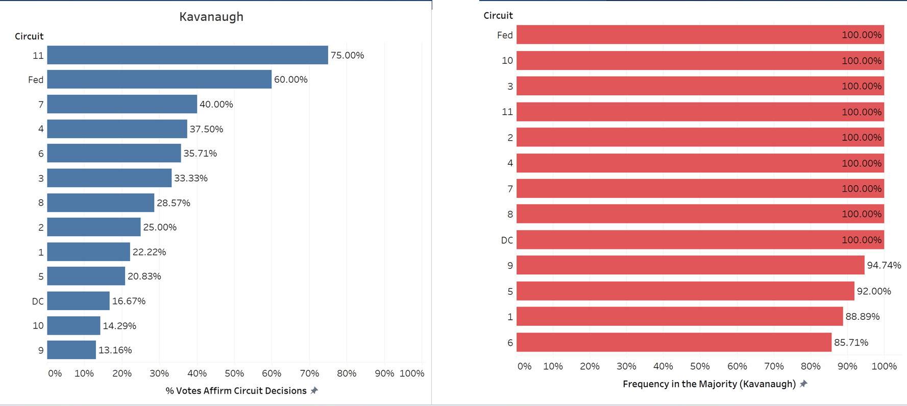 We also know from these data that Justice Kavanaugh’s positions most highly correlate (among the justices) with the Court’s decisions in these cases as he was in the majority nearly 100% of the time if not 100% of the time for decisions reviewing cases from each of the circuits.