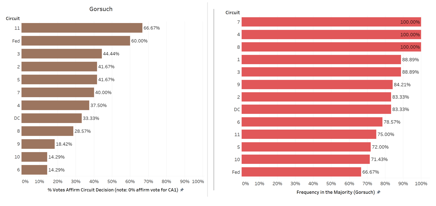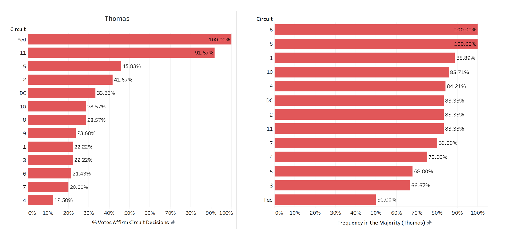 Several of the conservative justices had high overturn vote rates for the more liberal, D.C. Circuit’s cases, although Gorsuch and Thomas voted to uphold those decisions more frequently than the other conservative justices.