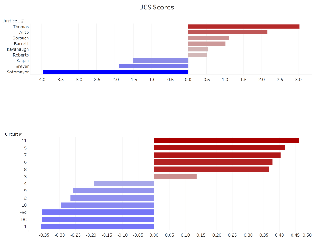 While there is no gold standard for measuring ideology of Supreme Court Justices, and there is even less regarding appeals court judges. Some including Epstein and her collaborators developed a useful approach called the Judicial Common Space (JCS) which bridges Supreme Court Justices’ positions with those of appeals court judges as they describe:
