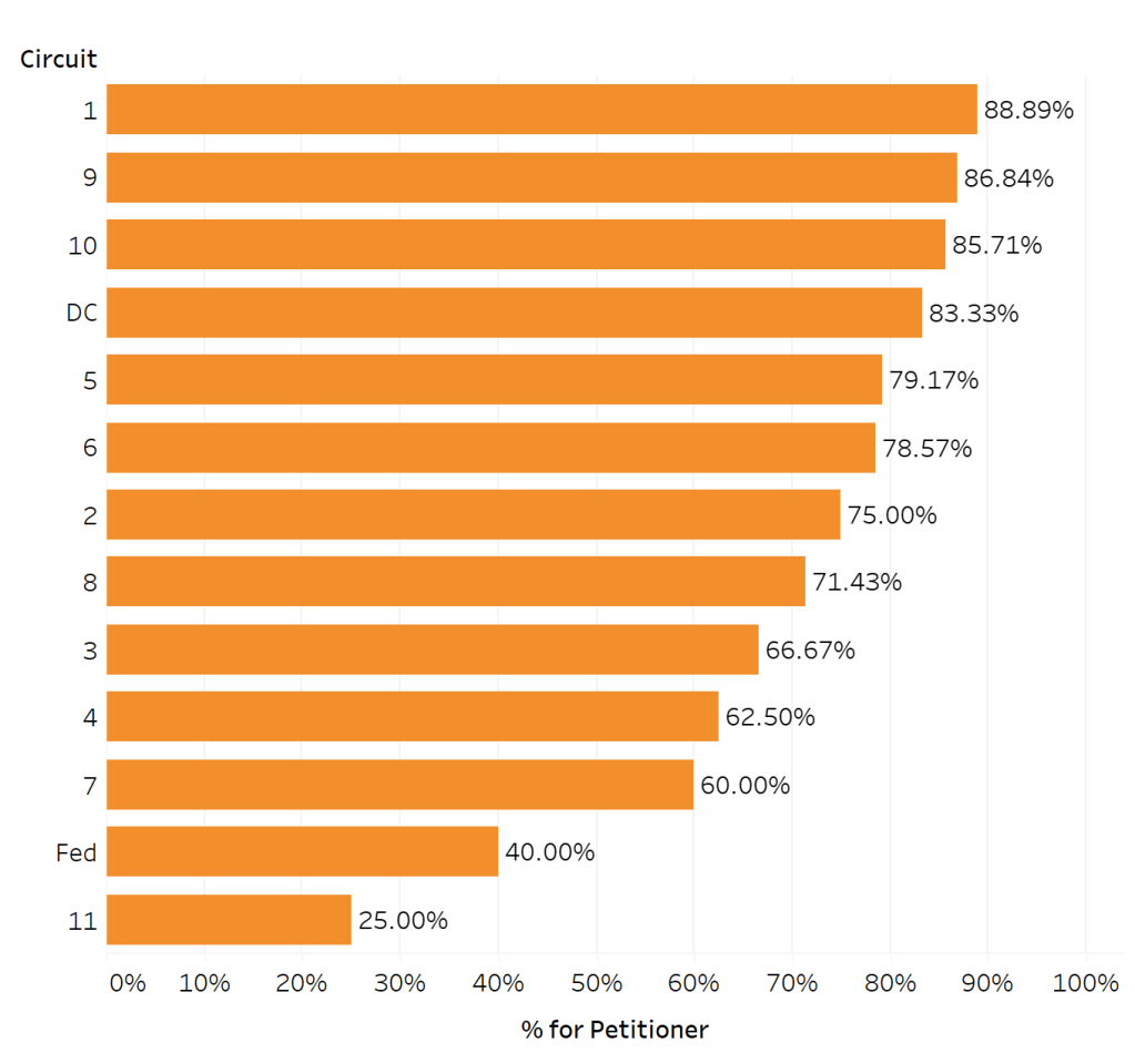 First, some baselines worth noting. This analysis uses three terms of data – from the 2020 through the 2022 term. To gain a better understanding of the justices’ positions relative to the circuits we can first look at the rates of petitioner wins (as coded in the Supreme Court Database) or when the lower court decision is not affirmed. [Note that this is a different measure than pure reversal rates used in other studies]