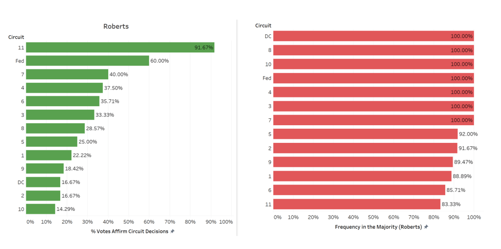 As we see from these justices, there is not always a strong correlation between the perceived ideology of the circuit and the justices’ ideological positions. The 11th Circuit is the most conservative circuit according to the JCS, but the three more liberal justices all had high rates of affirming that circuit’s decisions. It is also worth noting though that the justices’ percentages are more likely to fluctuate significantly if the Court took few cases from a circuit during this period.
