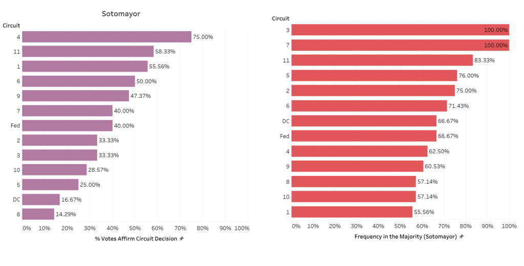 While most of the justices had relatively high rates of upholding decisions from the Federal Circuit, Sotomayor was a clear outlier in that respect. According to the JCS, the Federal Circuit is one of the more liberal circuits and this might explain why Justice Sotomayor had a particular affinity for those decisions.