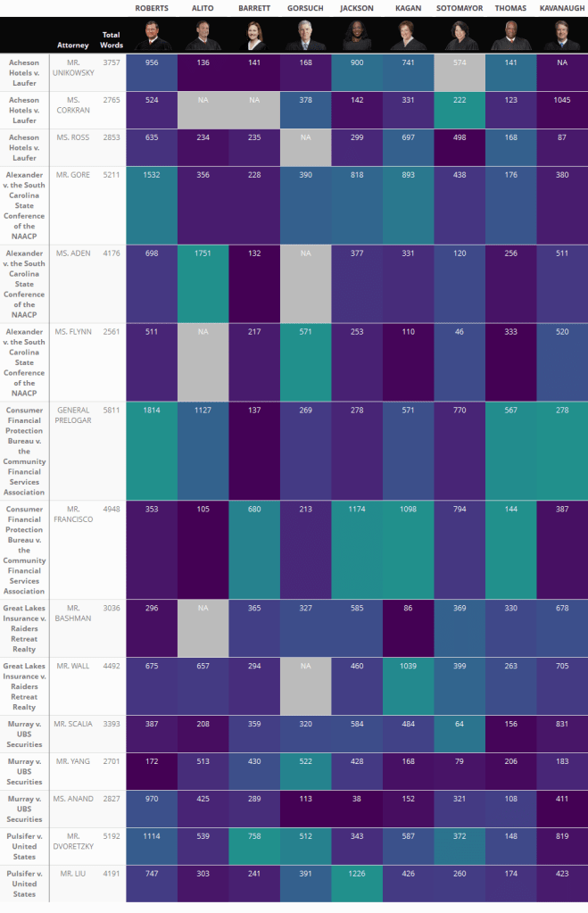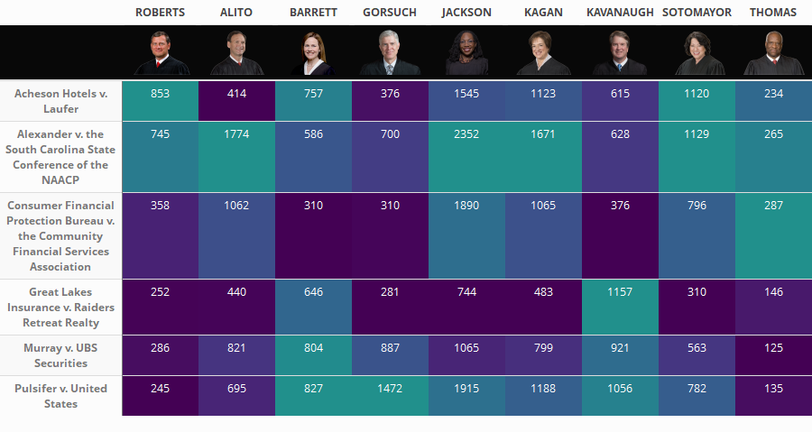 October 2023 Oral Arguments Words Spoken by Justice – By Argument Words Spoken by Arguing Attorneys – By Argument (October Term 2023) Share this: Click to share on X (Opens in new window) X Click to share on Facebook (Opens in new window) Facebook More Click to share on LinkedIn (Opens in new window) LinkedIn Like Loading...